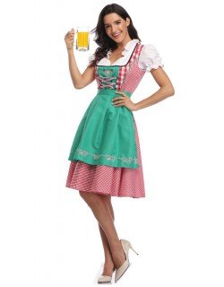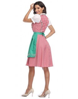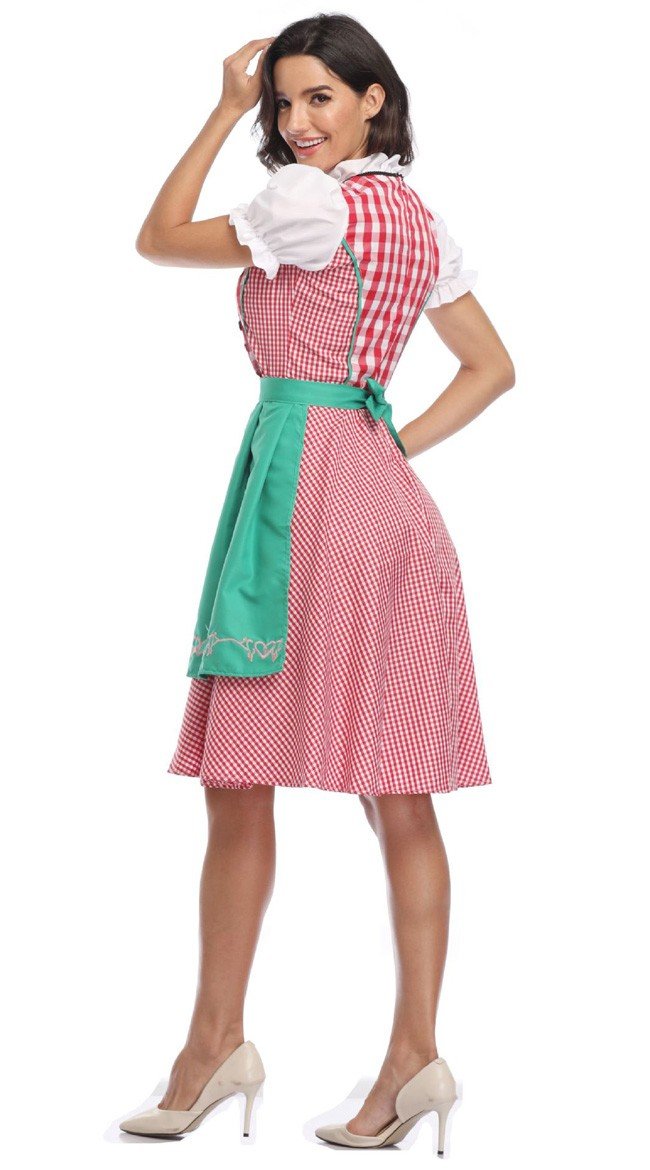Gingham tulenkestävä mekko ja vihreä esiliina brodeeratuilla koristekuvioilla, Oktoberfest asu sisältää mekko ja esiliina.